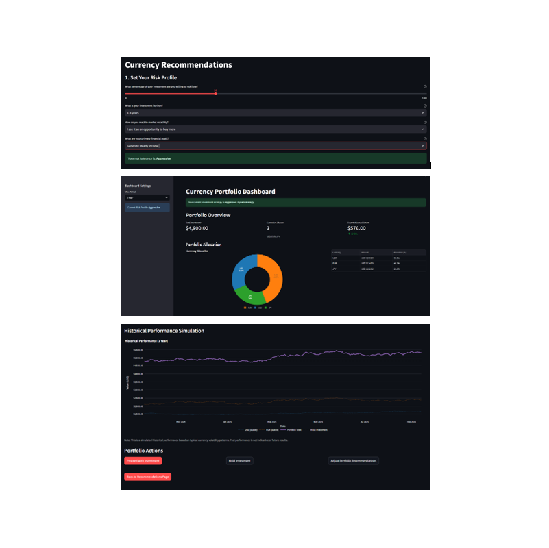 Designed and implmented a web app where users input a currency of interest and receive calculated investment allocations. The model uses historical trends and machine learning to optimize portfolio distribution for an investor.